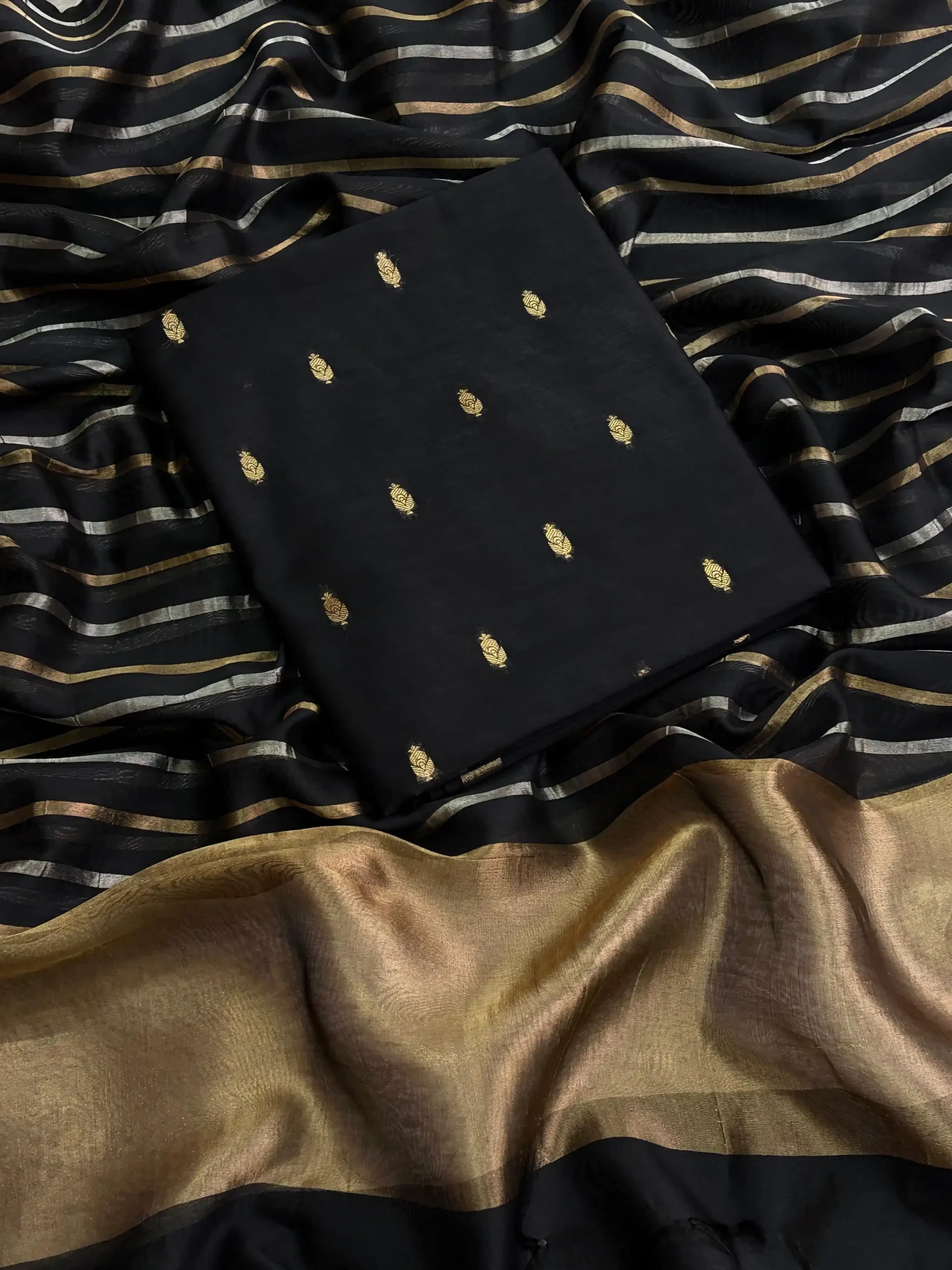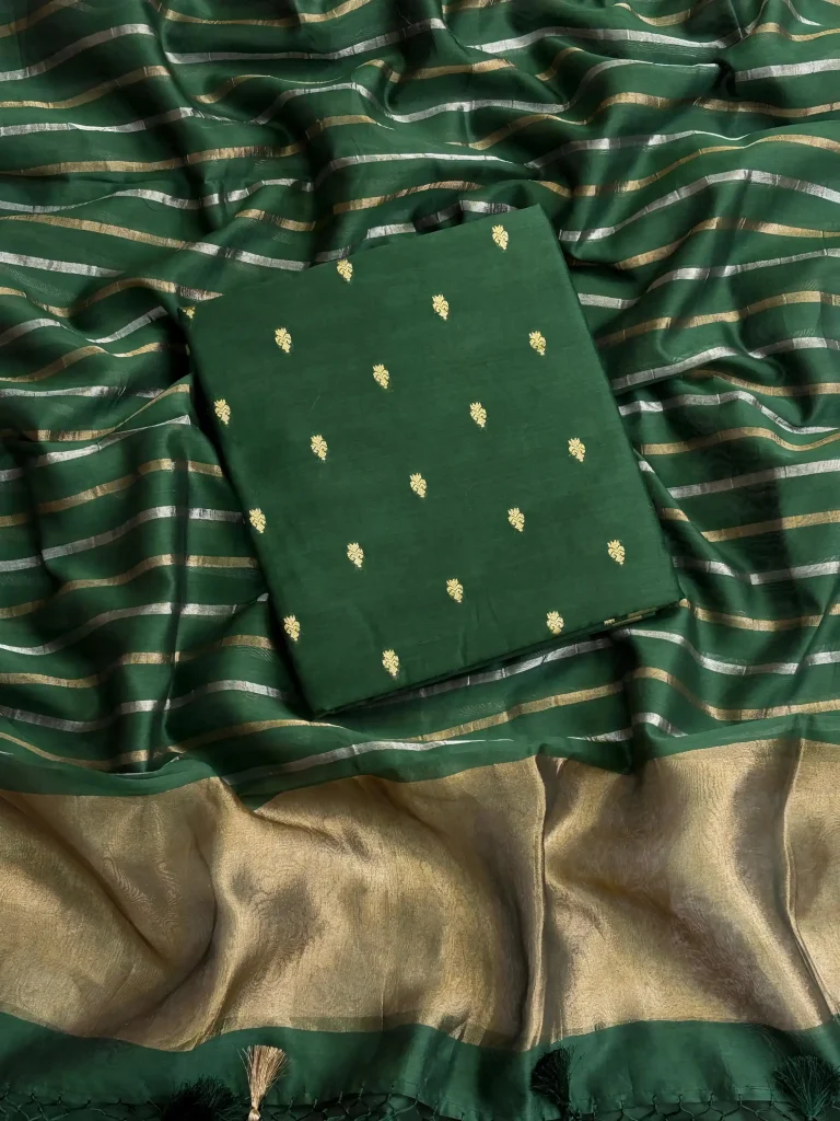 A refined Pure Chanderi Silk suit set, crafted for understated festive elegance Woven with delicate booti motifs that add timeless charm Lightweight silk texture offering a graceful, fluid drape The tissue stripe dupatta lends a soft shimmer and elevated finish Paired with a minimal plain Chanderi bottom for balanced sophistication